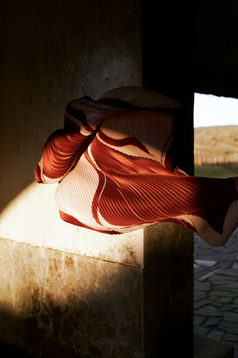 This commemorative scarf, created in collaboration with the National Taichung Theater, draws its inspiration from the building itself. Delicate pleating reflects the theater’s unique structural language and the flowing, three-dimensional qualities of its architecture.
